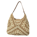 Precioso bolso en tejido de rafia sintética imitando al crochet con una forma muy bonita y un dibujo asimétrico en tono natural y color. Una única asa corta de polipiel al tono y forro de tela en color .NO TIENE ASA LARGA