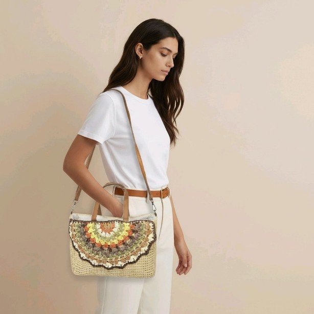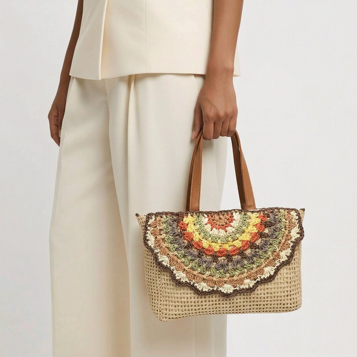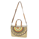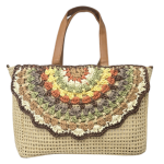 Precioso bolso realizado en rafias sintética con una solapa delantera tejida en el mismo tejido de fibra multicolor en amarillo, verde, caldera ,taupe ,chocolate…Asas de polipiel en tu nuevo cuero cortas para llevar de mano y asa larga para colgar.Forro de buena calidad