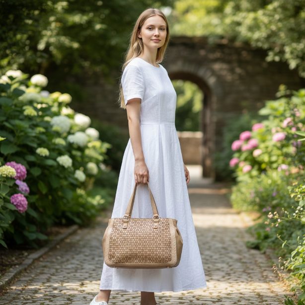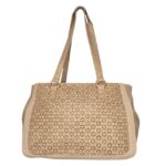 Bolso de tamaño medio -grande de polipiel, rectangular , por la parte delantera calada a modo de flores y la trasera lisa .Asas de polipiel para llevar al hombro, puede ampliarse su capacidad con los laterales cogidos con clip. Forradopor dentro con cremallera para llaves cremallera en la parte trasera..NO LLEVA ASA LARGA.