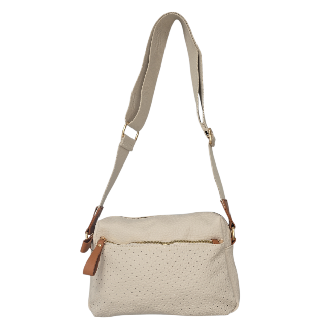 Bandolera pequeña realizada en polipiel texturizada con detalle picado en la parte delantera y bolsillo con cremallera.Bolsillo con cremallera también en la parte trasera forro interior y cremallera para las llaves. Tira de nylon regulable