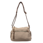 Bandolera de tamaño medio realizada en polipiel texturizada efecto tejido .Limpieza fácil con un paño húmedo .Mini bolsillos laterales dos bolsillos con cremallera en la parte frontal uno visible y uno oculto y cremallera en la parte trasera. Cremallera interior también para las llaves.Asas de polipiel regulable