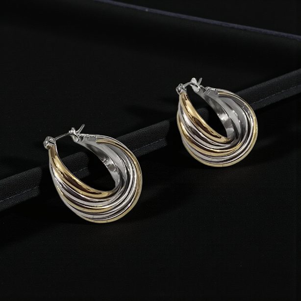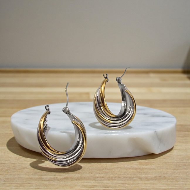 Realizado en acero inoxidable,los pendientes Armonía son sinónimo de elegancia.Una pieza duradera que completa cualquier look para hacerlo auténtico.Combina tono oro y plata con lineas torcidas en giro central.Cierre italiano.