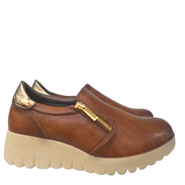 Mocasín realizado en polipiel calidad premium con cierre con cremallera en el lateral. Detalle de color y mini tachuelas en la trasera. Plantilla  muy confortable y  extraible.Altura aprox 4,5 cm .Camina en una nube.Según las valoraciones de nuestras clientas el 95% elige su talla habitual en este modelo.