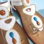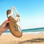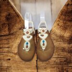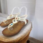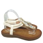 Sandalia tipo esclava de meter el dedo plana, con planta cómoda y piso goma.Tres abalorios en el empeine , con pequeños cristalitos alrededor , piedras marron y turquesa.