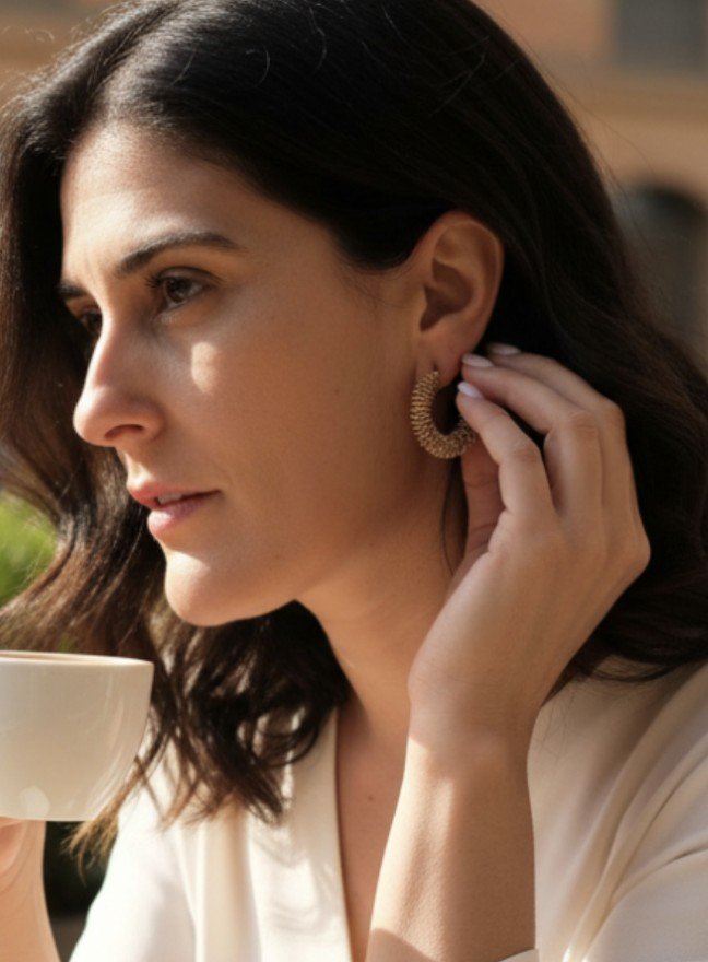 Realizado en acero inoxidable y laminado en oro el pendiente Jaleo es sofisticado y atemporal, un medio aro revestido con finos filamentos aportandole un aspecto diferente y moderno.Combinalo con un look casual o con una prenda más chic para darle un toque diferente.