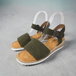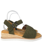 Cuña ligera realizada en antelina, con pala ancha plantada de gel y pulsera el tobillo con hebilla grande.Cuñita de esparto con piso dentado.