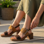 Preciosa sandalia ligera de tacón medio con la puntera cuadrada ,realizada en antelina con dos tiras una delantera con finas tachuelas y una al empeine regulable con una maxi hebilla tipo Carey en resina sujeción trasera al talón.Planta de gel Altura cuña: 6 cm – Altura suela: 1,7 cm