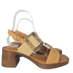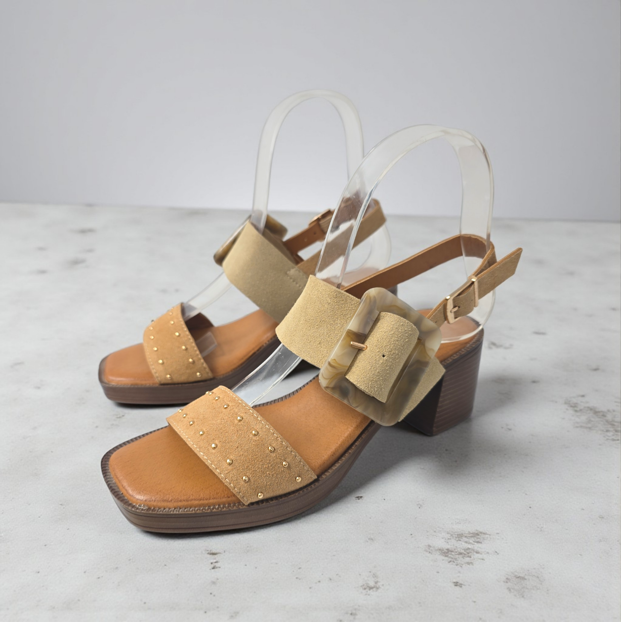 Preciosa sandalia ligera de tacón medio con la puntera cuadrada ,realizada en antelina con dos tiras una delantera con finas tachuelas y una al empeine regulable con una maxi hebilla tipo Carey en resina sujeción trasera al talón.Planta de gel Altura tacon: 6 cm – Altura suela: 1,7 cm