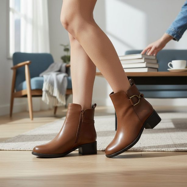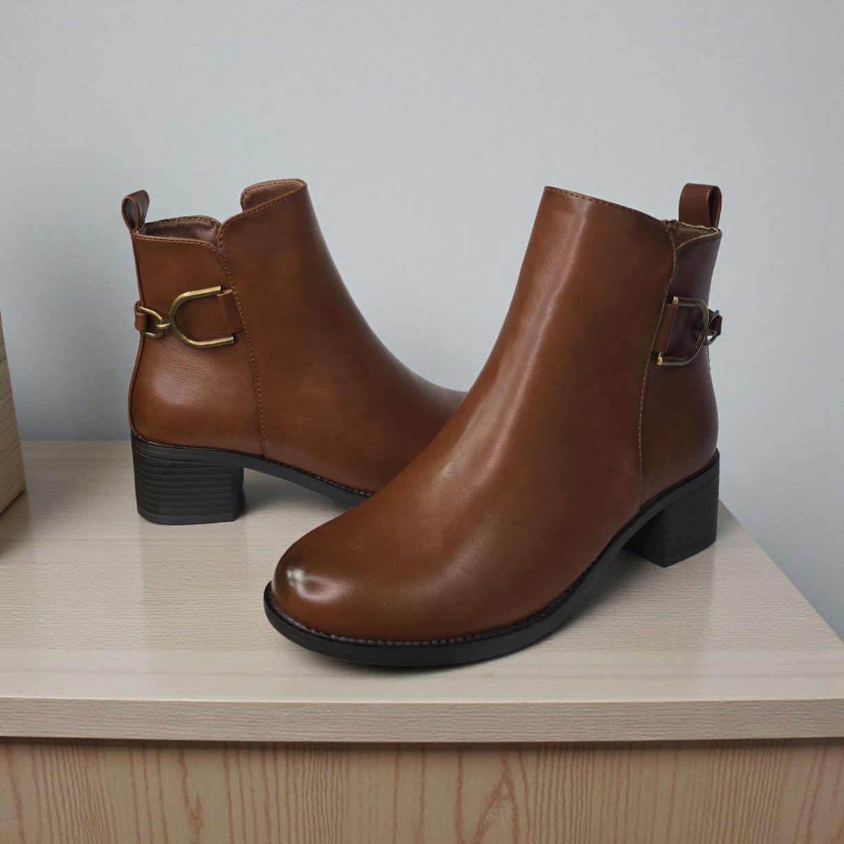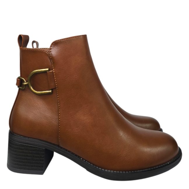 Botín de tacón medio,aprox 5 cm, ideal para el día a día ,realizado en polipiel con detalle de aplique en el lateral en color bronce en forma de estribo. Cremallera en la cara interior para poner y quitar y forro y plantilla de pelo suave. Talla normal.El 95% de las clientas eligen su numero habitual.