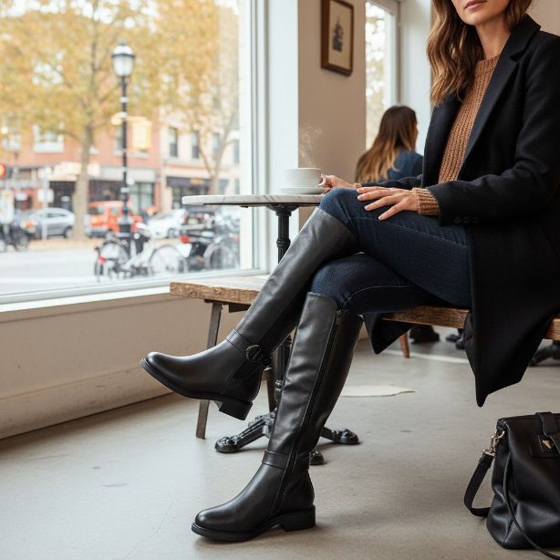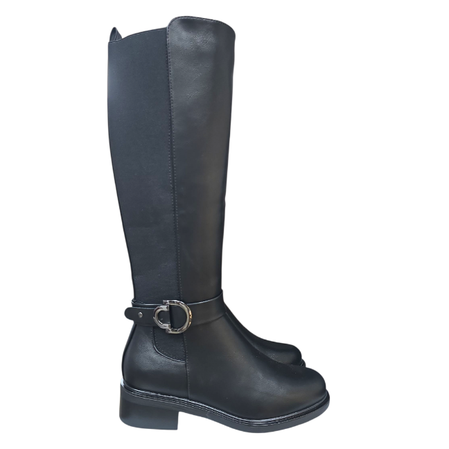 Bota de caña alta con gran elástico de 9 cm en la cara exterior para darnos un poco más de margen a la pantorrilla. Tacón bajo de aprox 4 cm , cremallera entera en la parte interior y forro de pelito suave. Aplique al tobillo en forma de D en color plomo. Altura aprox. de la caña 40 cm