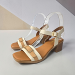 Sandalias realizada en polipiel con una tira delante combinada, con una maxi hebilla .Muy bonita y sencilla. Tacón cuadrado de goma imitando a madera y suela de goma. Planta cómoda.