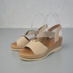 Cuña cómoda y ligera con planta de gel, abalorio central dorado del que salen dos elasticos para adaptarse a la perfección. Suela combinada imitando a esparto.Altura cuña: 6,5 cm , plataforma: 2,5 cm