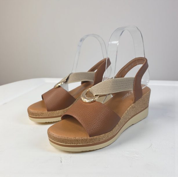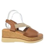 Cuña cómoda y ligera con planta de gel, abalorio central dorado del que salen dos elasticos para adaptarse a la perfección. Suela combinada imitando a esparto.Altura cuña: 6,5 cm , plataforma: 2,5 cm