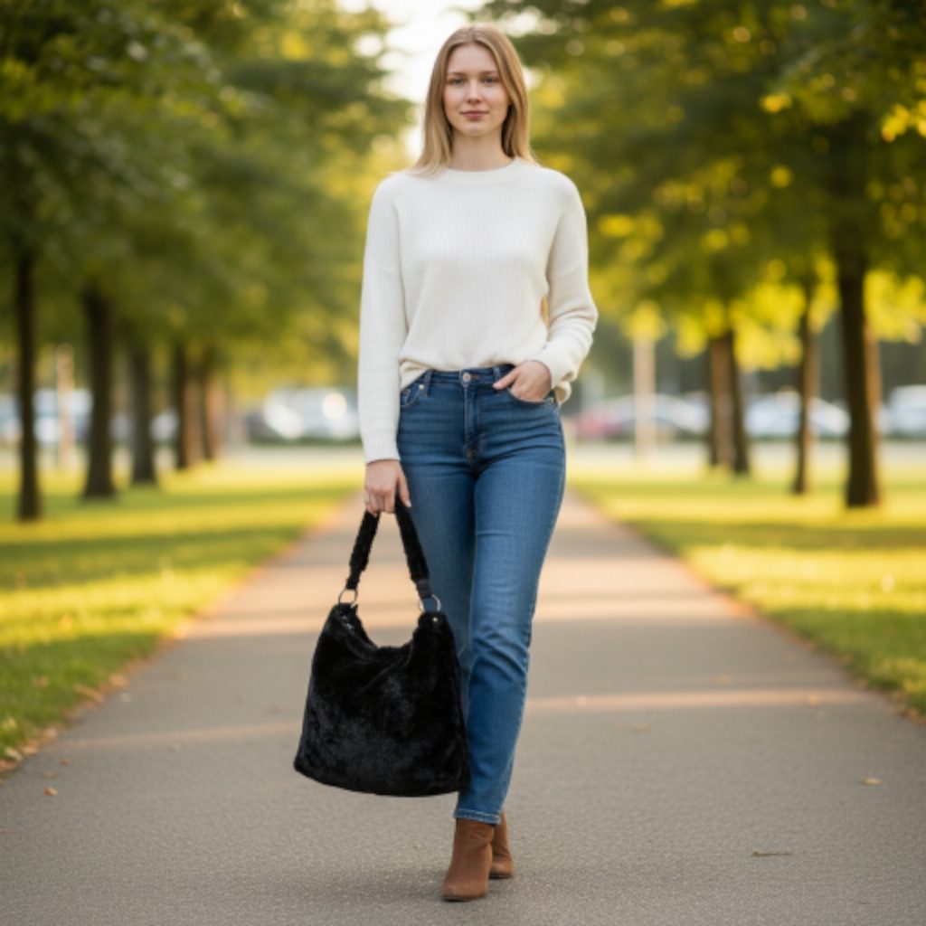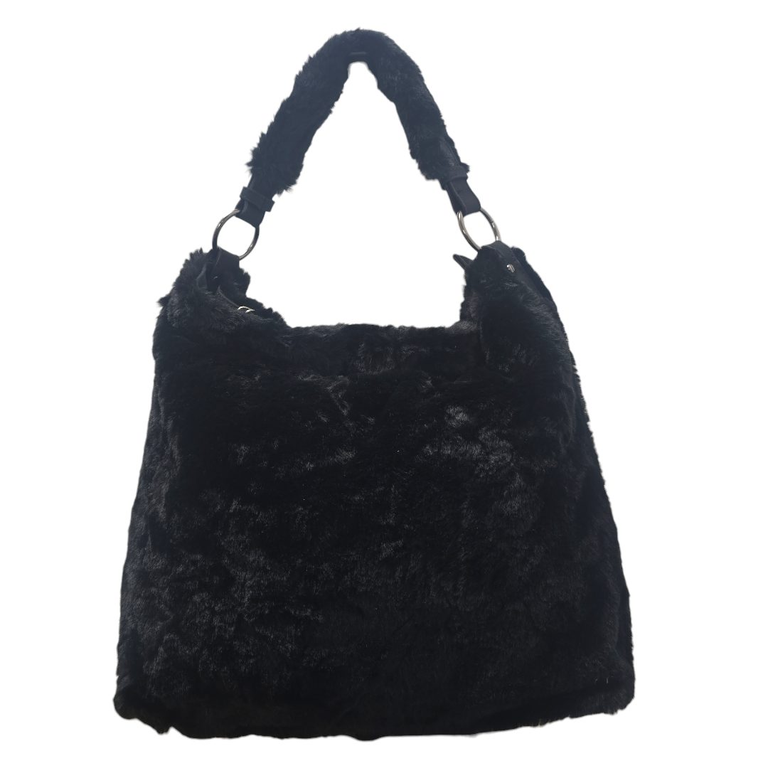 Bolso de pelo,tacto peluche , de tamaño medio, con una única asa de pelo. Forrado por dentro y cremallera para llaves. Lleva una asa larga de polipiel para colgarlo. Dimensiones aprox: Ancho 33 cm x 32 cm de alto x 15 cm de fondo.