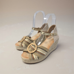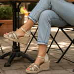 Espectacular cuña realizada en textil combinado y detalles de hilo dorado, con adorno de círculos central forrado al tono.Pulsera de polipiel al tobillo y trasera de saco. Planta de antelina gel confort. cuña: 8 cm – Altura plataforma: 2,5 cm