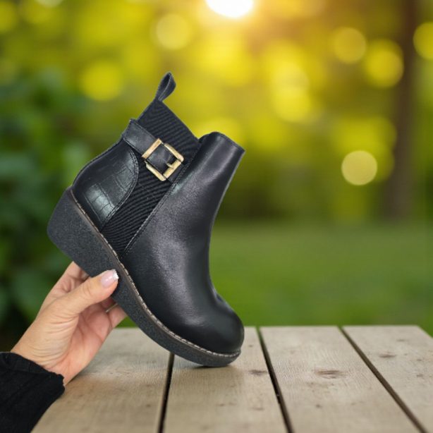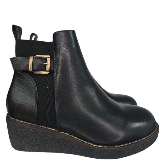Botín realizado en polipiel con una cuñita en goma . Combinada en polipiel lisa en la parte delantera y efecto coco en la parte trasera. Detalle de elástico lateral con hebilla superpuesta. Cremallera en la parte interior y forro de pelito fino. Altura de la cuñita: aprox 5 cm . Talla en su número el 95% de nuestras clientas elige su número habitual de bota.
