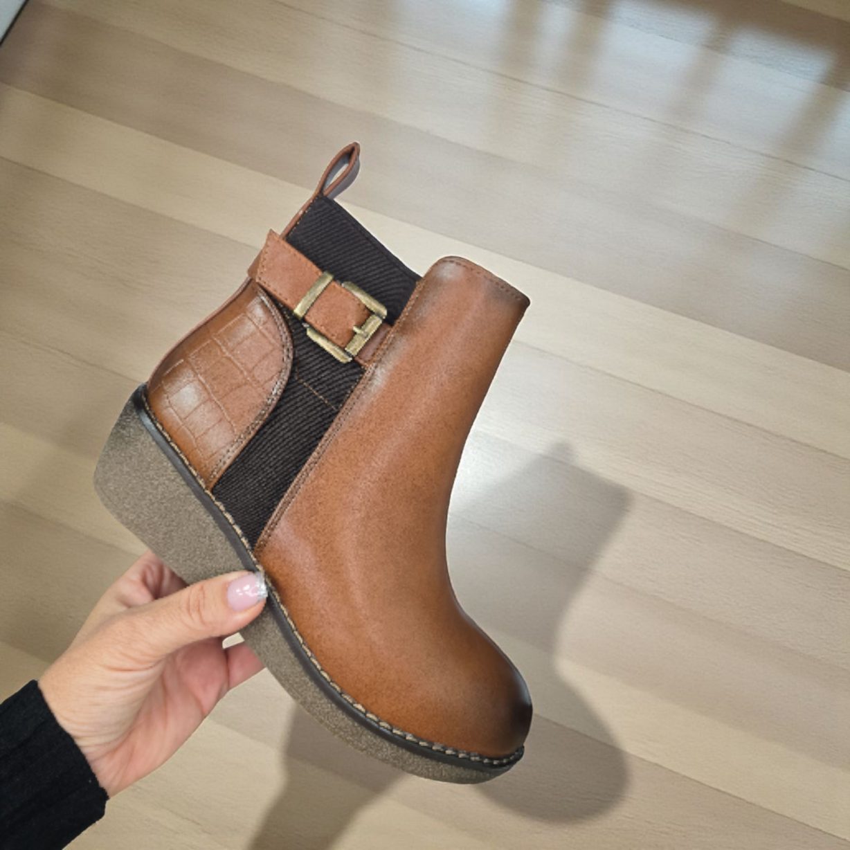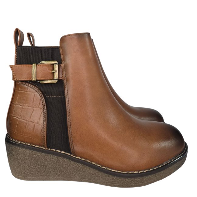 Botín realizado en polipiel con una cuñita en goma . Combinada en polipiel lisa en la parte delantera y efecto coco en la parte trasera. Detalle de elástico lateral con hebilla superpuesta. Cremallera en la parte interior y forro de pelito fino. Altura de la cuñita: aprox 5 cm . Talla en su número el 95% de nuestras clientas elige su número habitual de bota.
