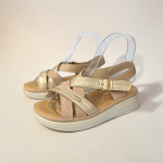 Sandalia comodona realizada en polipiel en mate, con tiras con brillo dorado .Planta anatómica súper confortable y blanda .Sujecion con hebilla al empeineAltura suela talon: 4 cm – Altura suela: 2,5 cm