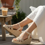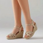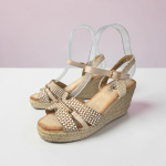 Cuña de esparto ligerisima, no pesa nada.Realizada en polipirñel con bonito patrón de hilo y aplique dorado.Trasera fina de saco y pulsera beig de polipiel al empeine.Planta antelina gel.