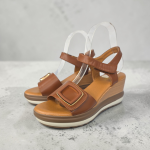 Sandalia ligera de cuña con velcro delantero para un perfecto ajuste con un aplique dorado que le da un toque especial.Ajusta con pulsera de velcro al tobillo.Planta de gel.Altura cuña: 7,5 cm – Altura plataforma: 3,2 cm