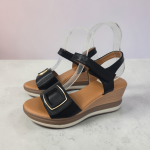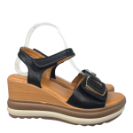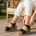Sandalia ligera de cuña con velcro delantero para un perfecto ajuste con un aplique dorado que le da un toque especial.Ajusta con pulsera de velcro al tobillo.Planta de gel.Altura cuña: 7,5 cm – Altura plataforma: 3,2