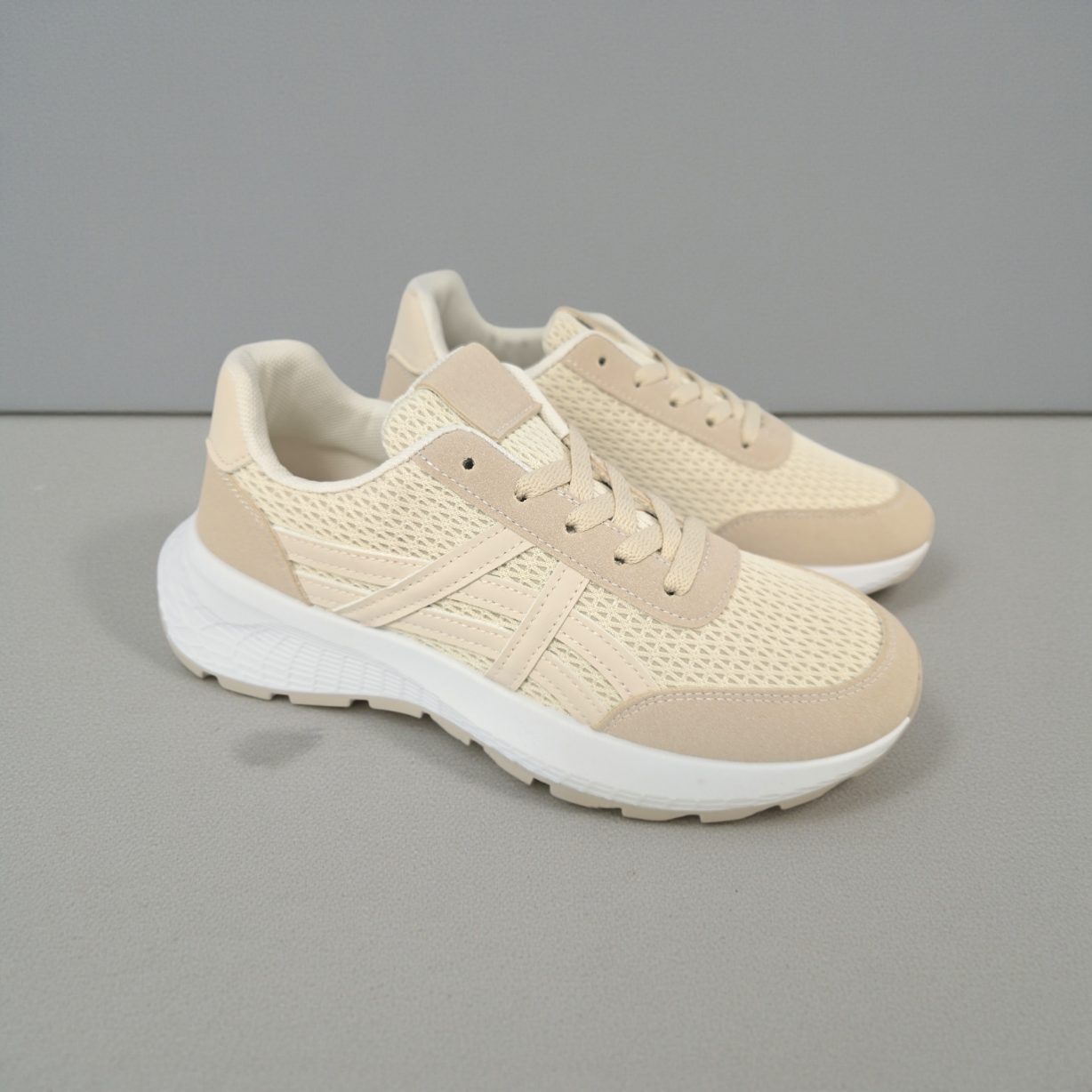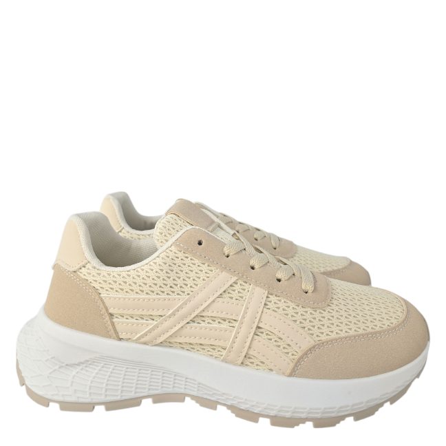 Deportivo sport realizado en textil efecto malla y combinado con piezas de antelina beig . Líneas laterales que le dan un aspecto más .Plantilla extraible.Altura aprox 4 cm .Ideal para leggins o jeans , con sudaderas o chaquetas deportivas.ESTE DEPORTIVO TALLA JUSTO,el 95% de nuestras clientas ELIGEN UN NUMERO MAYOR