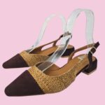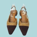 Precioso zapato de puntera con talon descubierto . realizado en tejido imitando rafiadas sintética un bicolor muy bonito con la puntera en antelina marrón.Pequeño tacón forrado en antelina al tono de de altura 3,3 cm y sujeción con hebilla trasera el talón llevando la tira cejada.