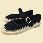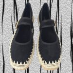 Mercedita realizada en antelina con la puntera cuadrada y bonito bordado en hilo beig, cosida toda al rededor. Suela de esparto y piso de goma. Plantilla de antelina cómodisima. Sujeción con hebilla al empeine. Altura aprox 2 cm