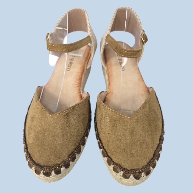 Esparto cerrada realizada en antelina con el corte en V que da un poquito más de apertura. Lleva un bordado de cuerda e hilo con un patrón muy bonito. Planta de antelina gel muy cómoda , trasera de saco y sujeción con pulsera de antelina al tono. Altura aprox 3,5 cm .