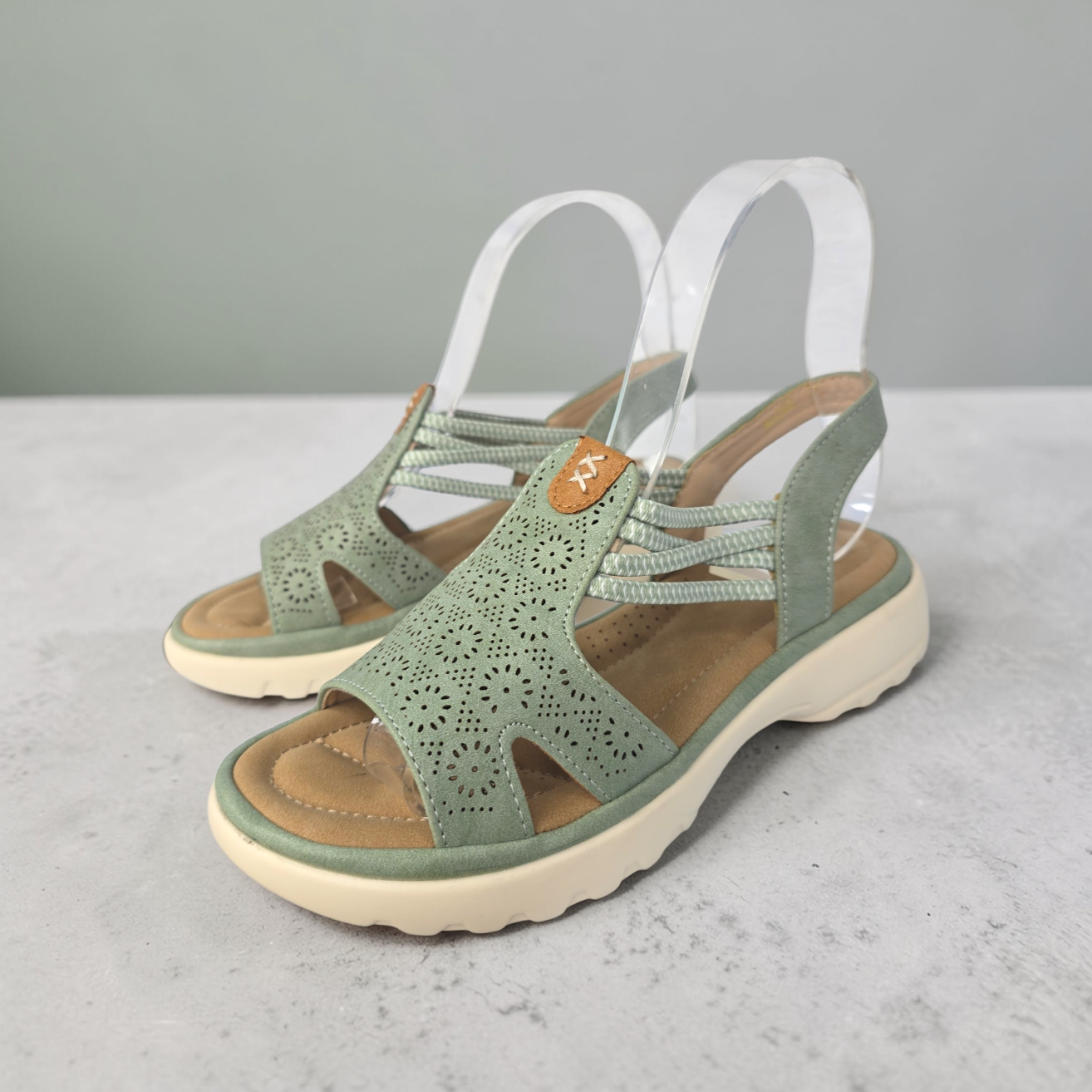 Sandalia cómoda y ligera con la pala en laser con dibujo de florres ajuste con elasticos laterales.Planta cómoda.TALLA JUSTA.Altura trasera: 3,4 cm – Altura suela: 2 cm
