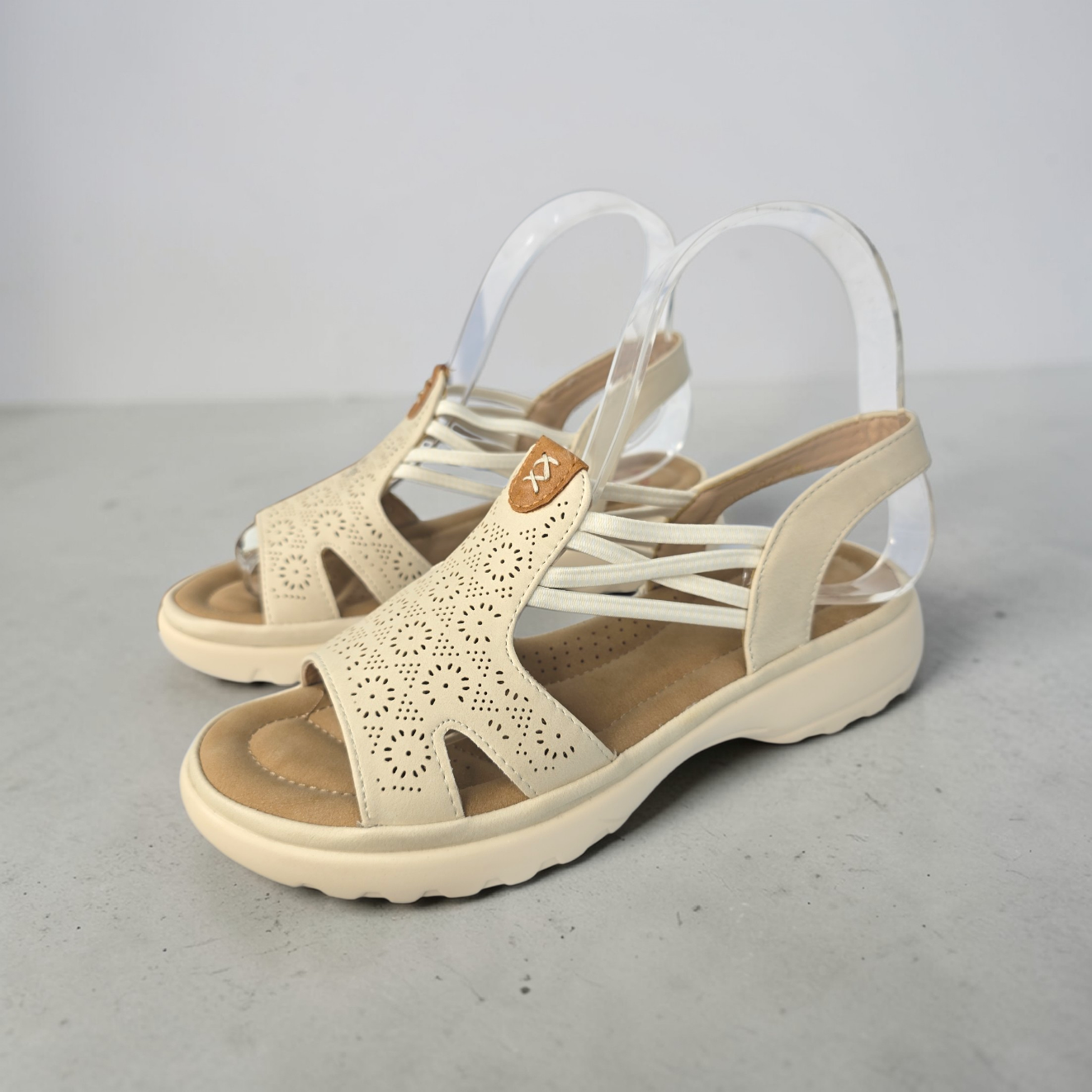 Sandalia cómoda y ligera con la pala en laser con dibujo de florres ajuste con elasticos laterales.Planta cómoda.TALLA JUSTA.Altura trasera: 3,4 cm – Altura suela: 2 cm