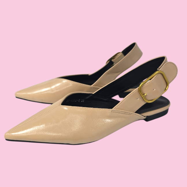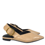 Zapato plano semidescubierto, tipo mulé con sujeción trasera, realizado en polipiel con gran hebilla cuadrada, puntera y corte en V en el empeine ideal para darle un poquito de anchura. Planta cómoda y suela fina de goma.Altura de la tapa aprox 1,5 cm