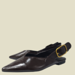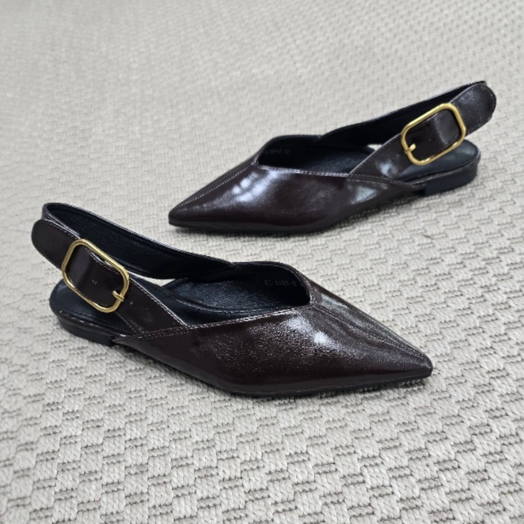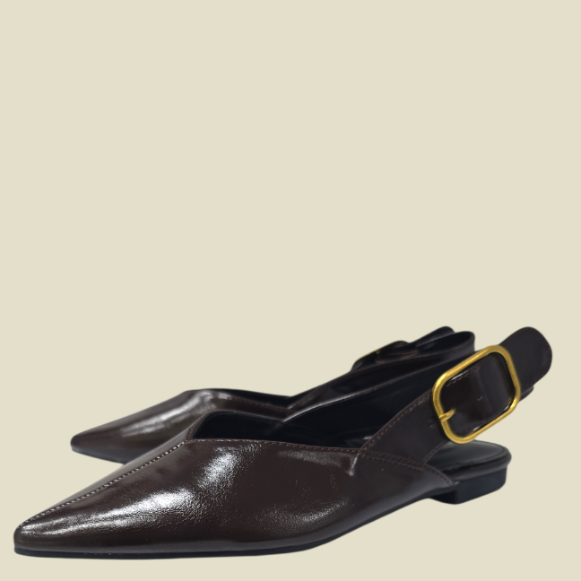 Zapato plano semidescubierto, tipo mulé con sujeción trasera, realizado en polipiel con gran hebilla cuaf¡drada, puntera y corte en V en el empeine ideal para darle un poquito de anchura. Planta cómoda y suela fina de goma.Altura de la tapa aprox 1,5 cm