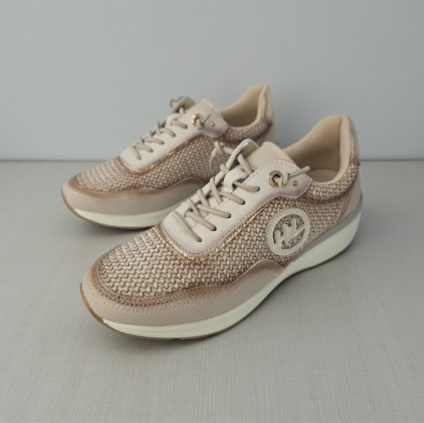 Deportivo vestir de máxima calidad, realizado en polipiel   efecto trenzado, imitando a  rafia en degradado, traspirable, pues el forro interior  es de una especie de tul suave .Ideal para primavera, detalles de color taupe  en la puntera y talón con dorado. Talonera acolchada. Plantilla de gel confort extraible. Ligerísimos.Cordones elásticos para mayor comodidad de calce. Altura aprox 3 cm . Calzan como un guante. Comodidad garantizada.Media cuñita para mayor comodidad . Altura 2,5 c por delante y 5 cm de cuña. Acierto seguro