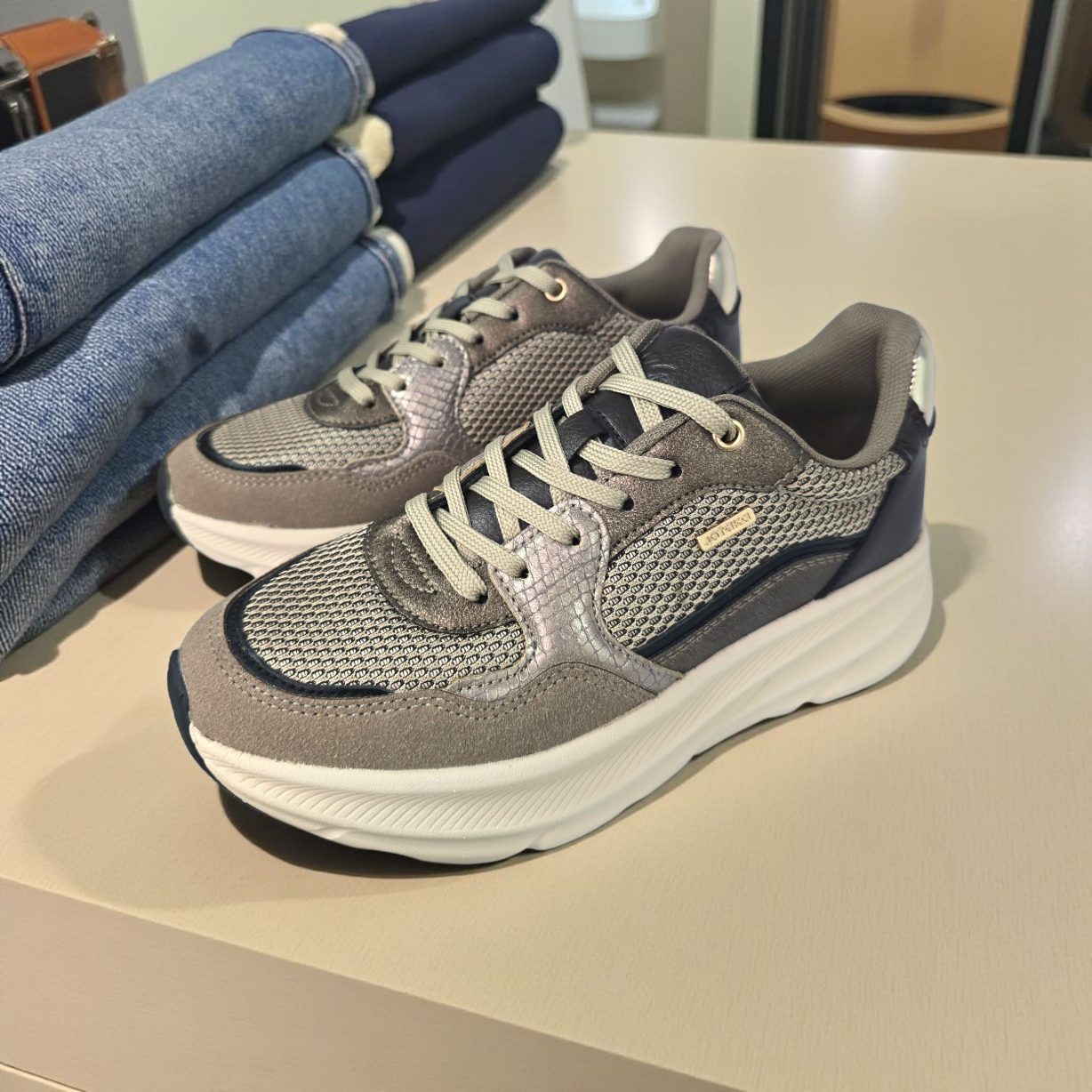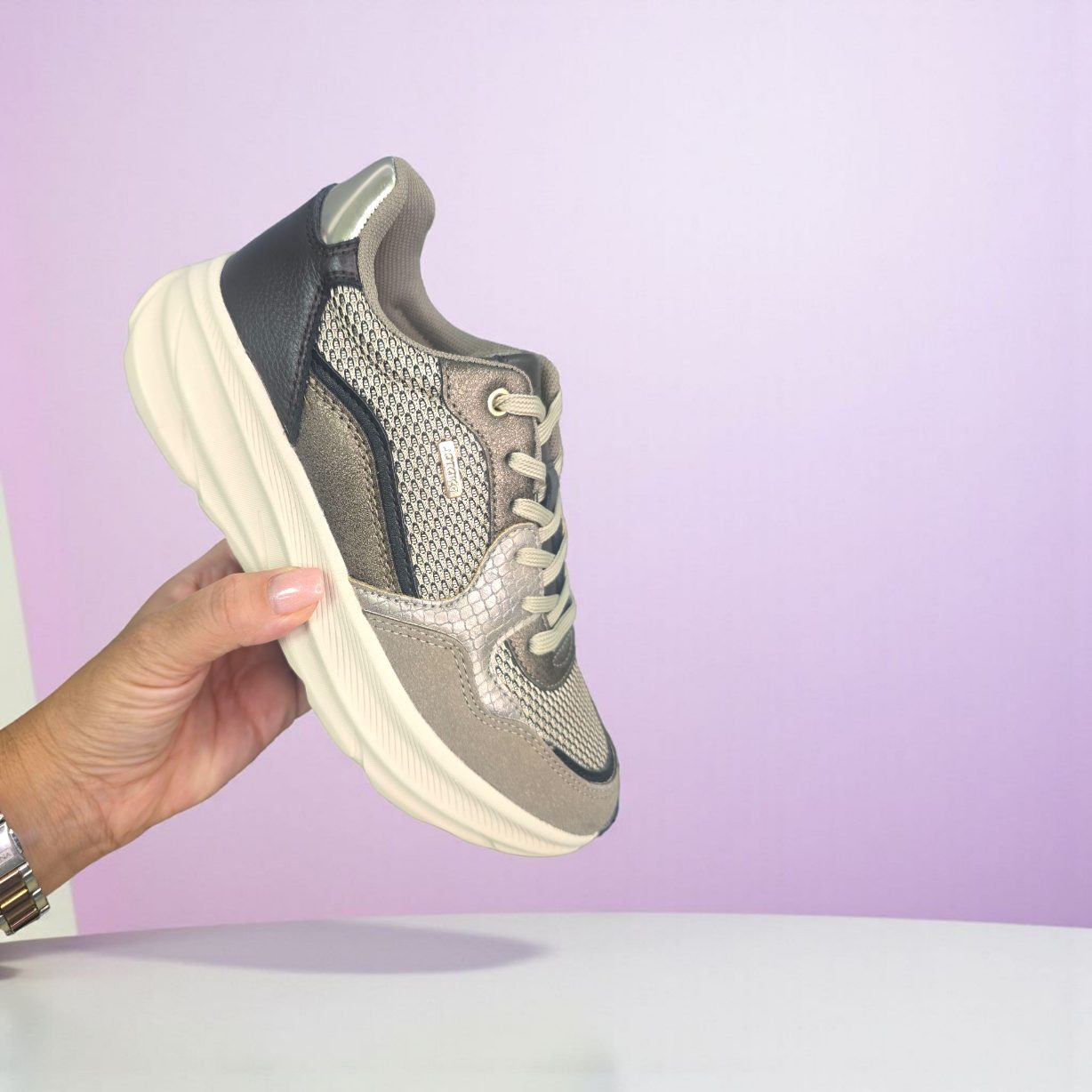 Deportivo premium de calidad superior. Ligero y muy cómodo con diseño de antelina , polipiel y cuerpo en textil. Piso anatómico. Plantilla de gel extraible. Es caminar e una nube.Altura aprox 4,5 cm . El 90% de nuestras clientas eligen su número habitual de deporte,y las que dudan entre dos números eligen el mayor