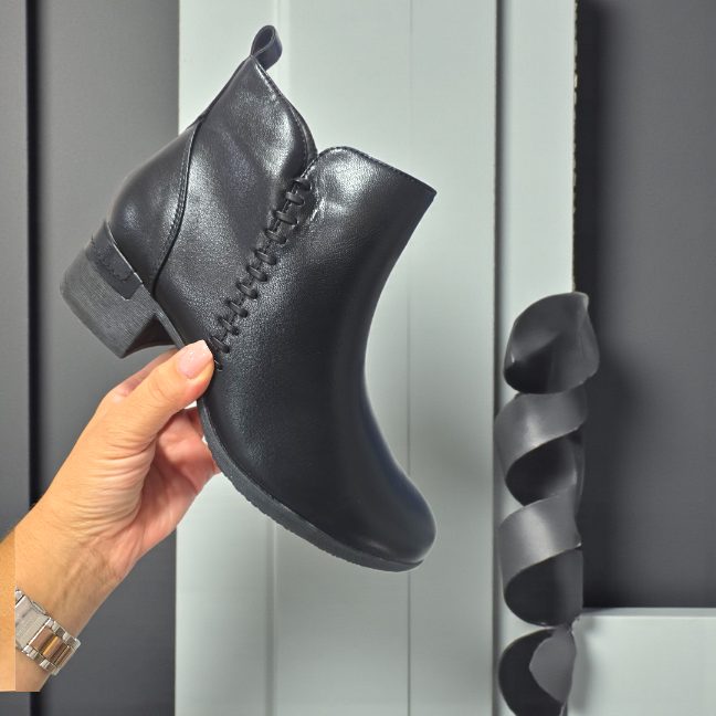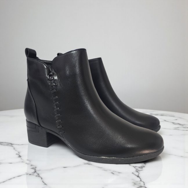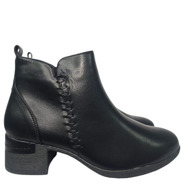 Botín de tacón medio realizado en polipiel con detalle de pespunte de polipiel en el lateral. Detalle también en polipiel en el talón y en la parte superior del tacón. Cremallera en la parte interior. Forro de pelito suave. Altura aprox 4 cm . Talla normal . El 95% de nuestras clientas eligen su número habitual de botín