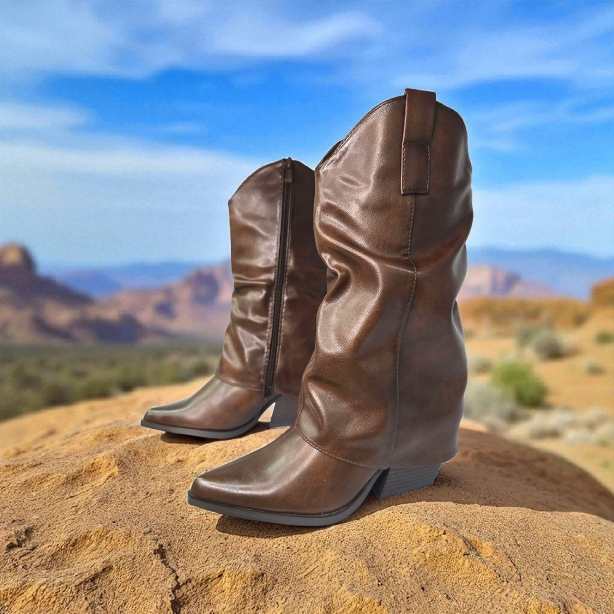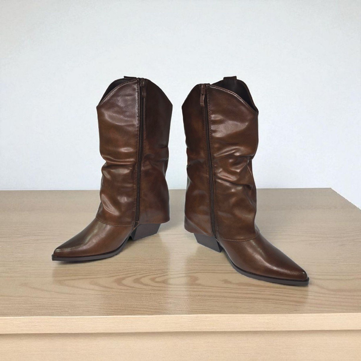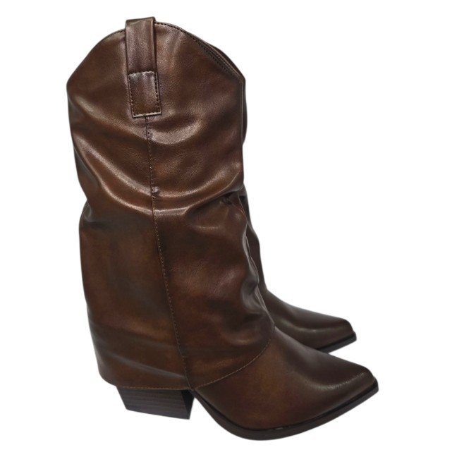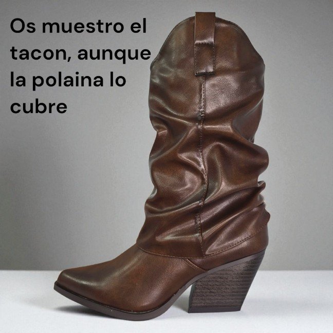 Bota campera de puntera lisa en polipiel  con polaina superior efecto arruga. Detalle de cremallera enteriza en la parte interior para su perfecto calce. Tacón cubano de 6 cm y  altura de la caña de 26,5 cm aprox.Segun las valoraciones de nuestras clientas el 95% eligen su numero habitual de bota
