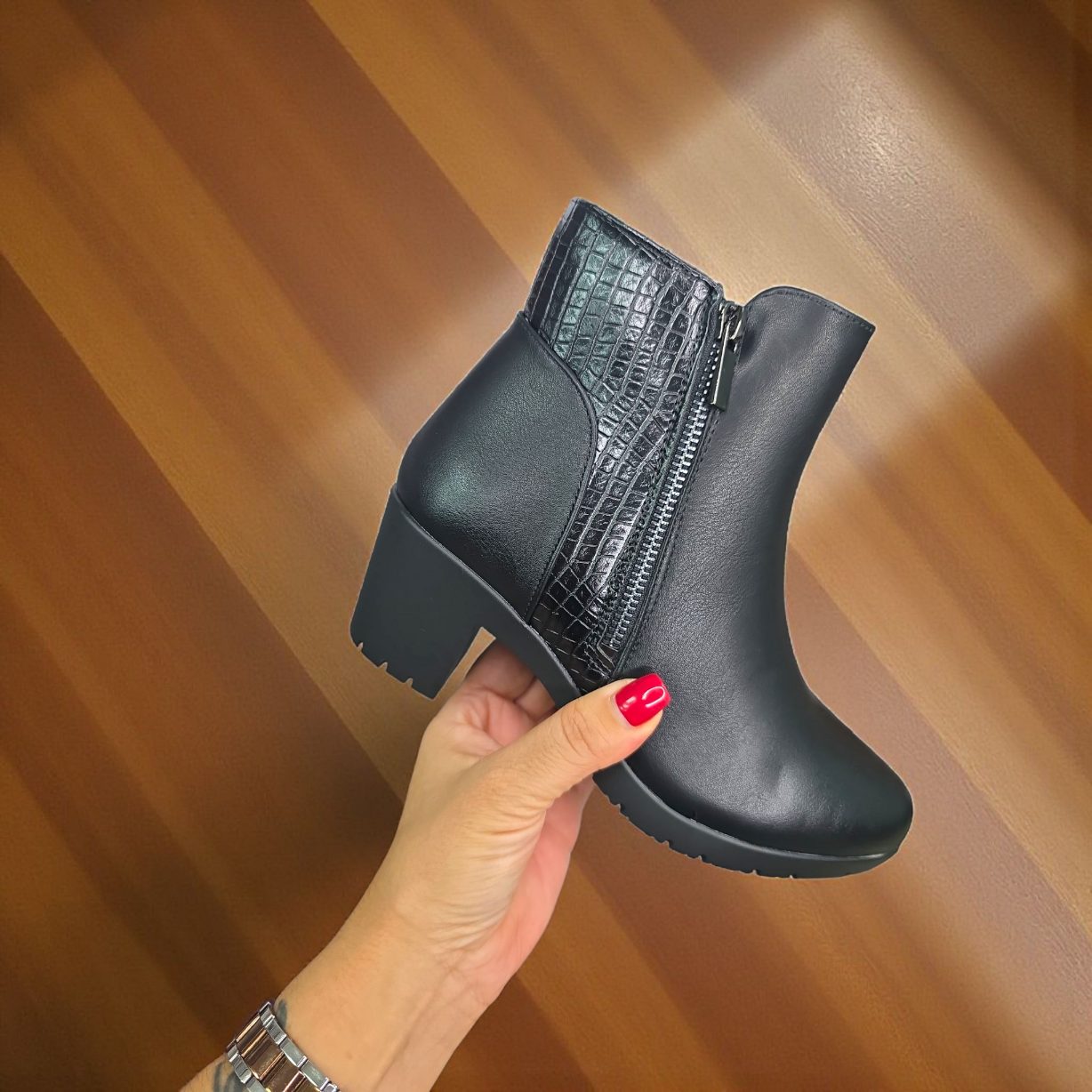 Botín de tacón medio realizado en polipiel  suave con diseño de símil de coco en la parte trasera. Detalle de cremallera de adorno en el lateral y cremallera funcional en la parte interior. Forro textil . Ligeras. Tacón cómodo de  6 cm y altura de la caña aprox 15 cm .Talla en su número. El 95% de nuestras clientas eligen su número habitual de botín.