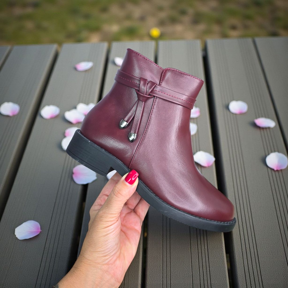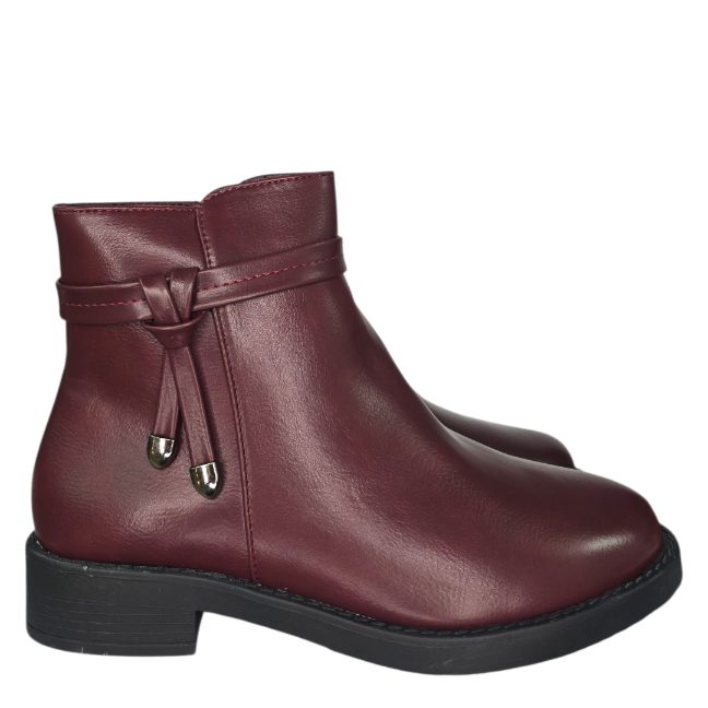 Botín plano realizado en polipiel , liso, con adorno de nudo en el lateral en la misma polipiel. Cremallera en la parte interior para poner y quitar. Forro textil. Tacón de 3 cm . Altura aproximada de la cña14 cm .Talla en su número. El 95% de nuestras clientas eligen su número habitual de botín.