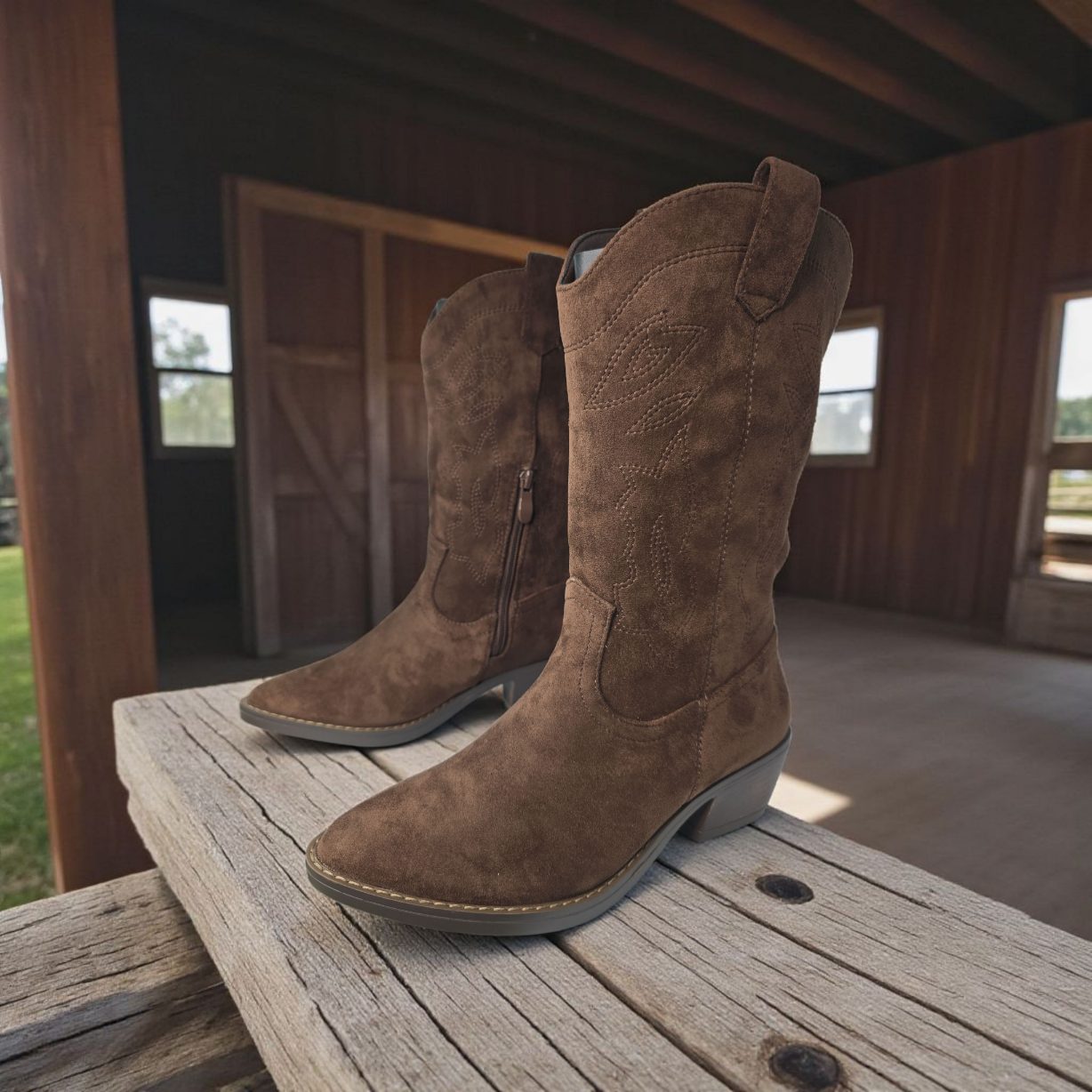 Bota campera realizada en antelina de media caña de corte campero con la pala lisa y la caña con bordado clasico en hilo al tono. Tacon cubano de 5 cm y altura aproximada de la caña 25,5 cm . Bota cómoda y del color en tendencia. Talla normal, el 95% de nuestras clientas eligen su número habitual de bota.
