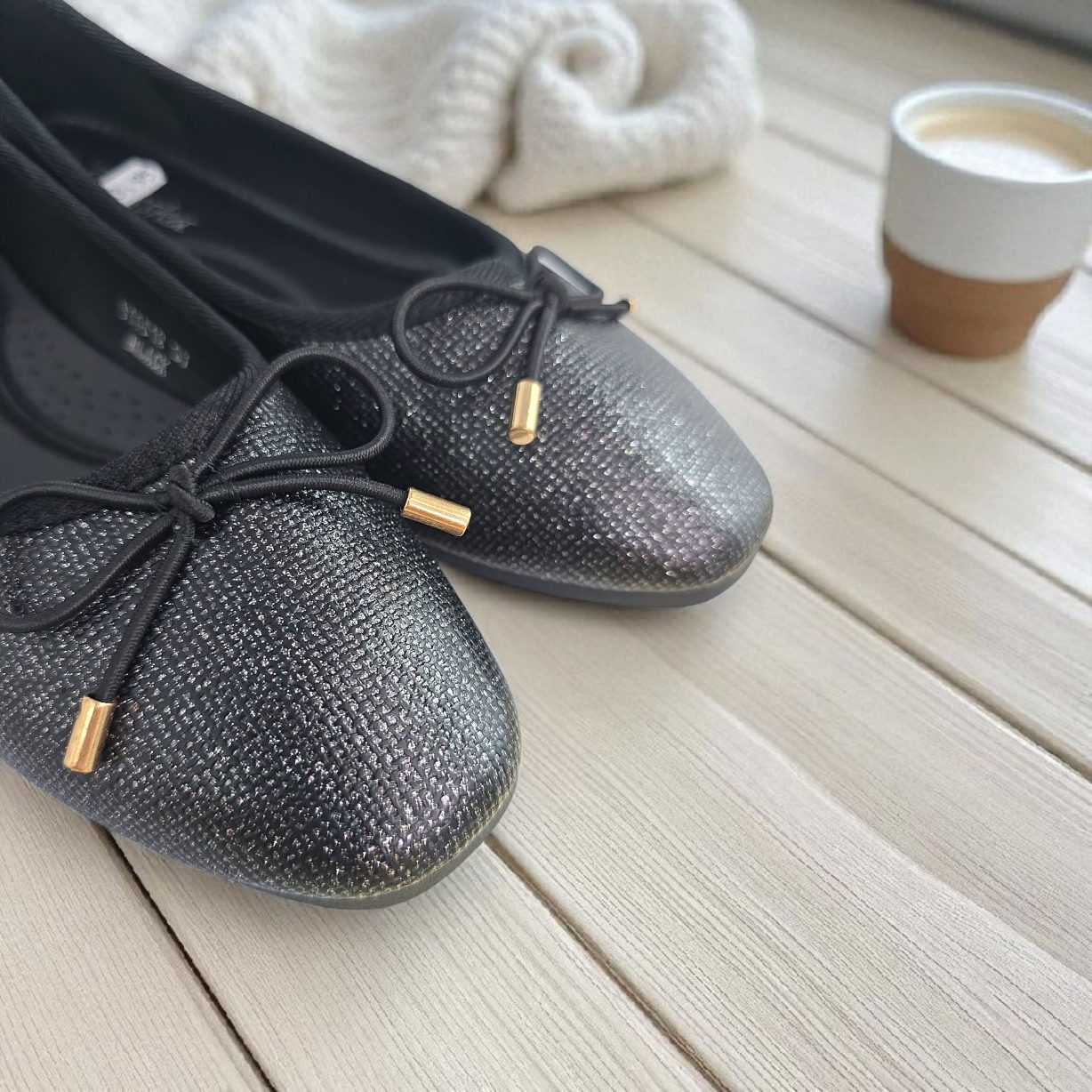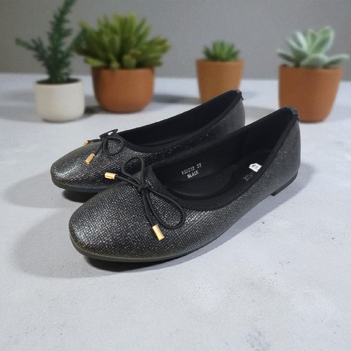 Manoletina realizada en polipeil efecto detalle de brillo plata, con el clásico lazo de goma en la pala con terminaciones doradas. Plantilla acolchada , muy cómoda. Talla en su número.