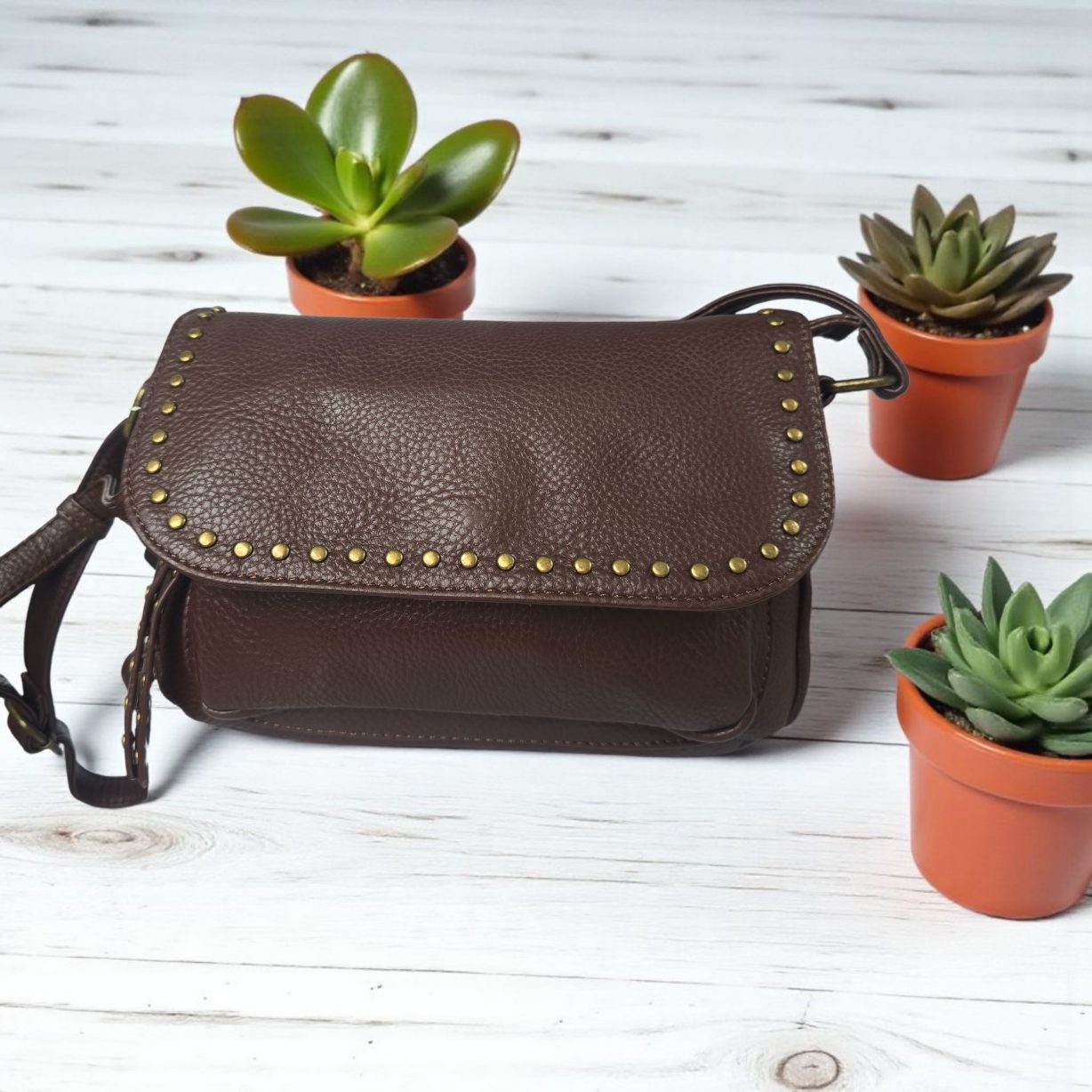 Bandolera realizada en polipiel efecto cuero, de tamaño perfecto para el día a día con solapa cpn clip y detalle de tachuelas ronce. Bolsillo con cremallera bajo la solapa. Cierre con cremallera, cremallera trasera y cremallera interior para llaves. Asa larga regulable.