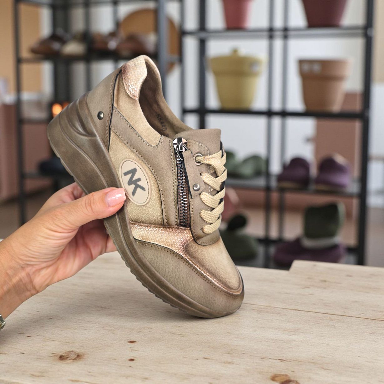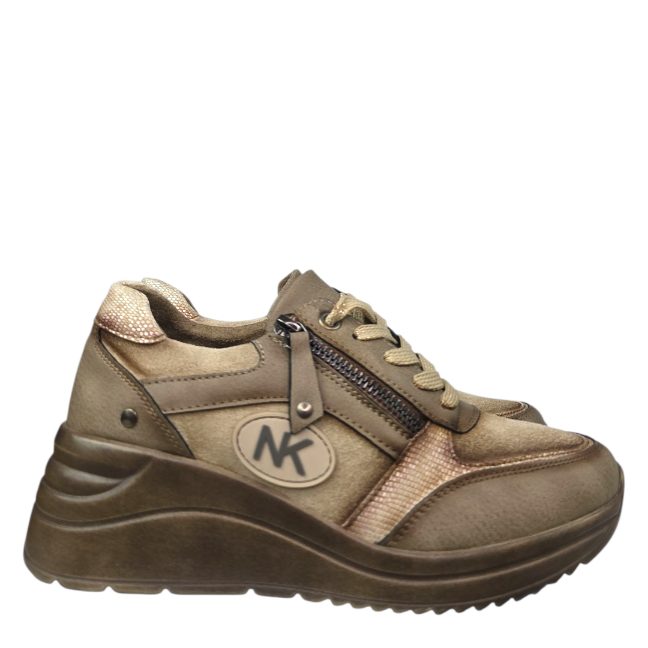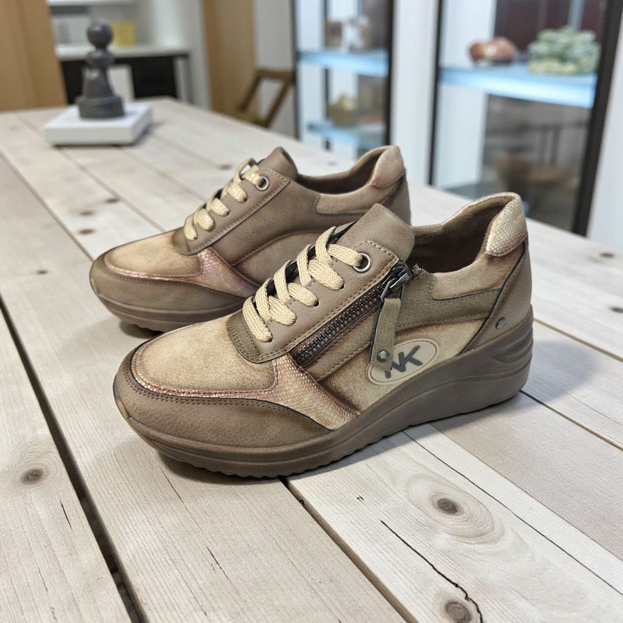 Deportivo con cuña de máxima calidad realizado en poliel y antelina cepillada. Cordones normales para ajustar pero cremallera útil para mayor comodidad. Planta de gel confort. Muy cómodo para el día a día. Altura aprox de la cuña 5,5 cm . Según las valoraciones de nuestras clientas este deportivo talla en su número