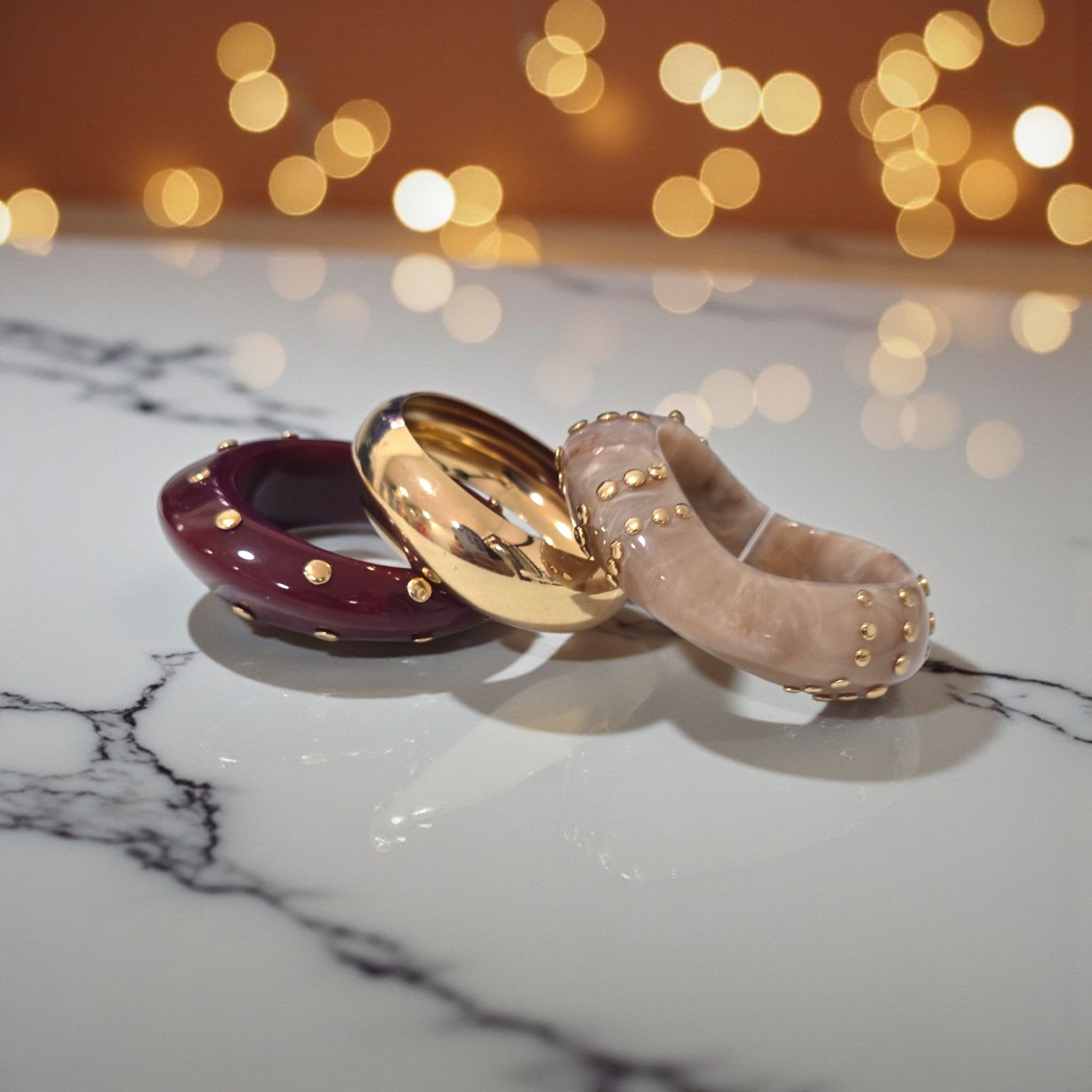 Trío de pulseras zra,realizadas en resina con tachuelas doradas, asimétricas,burdeos y nacarada rosa y lisa en metal dorado.Llevalas juntas o separadas según tu preferencia para tus looks y eventos más top.
