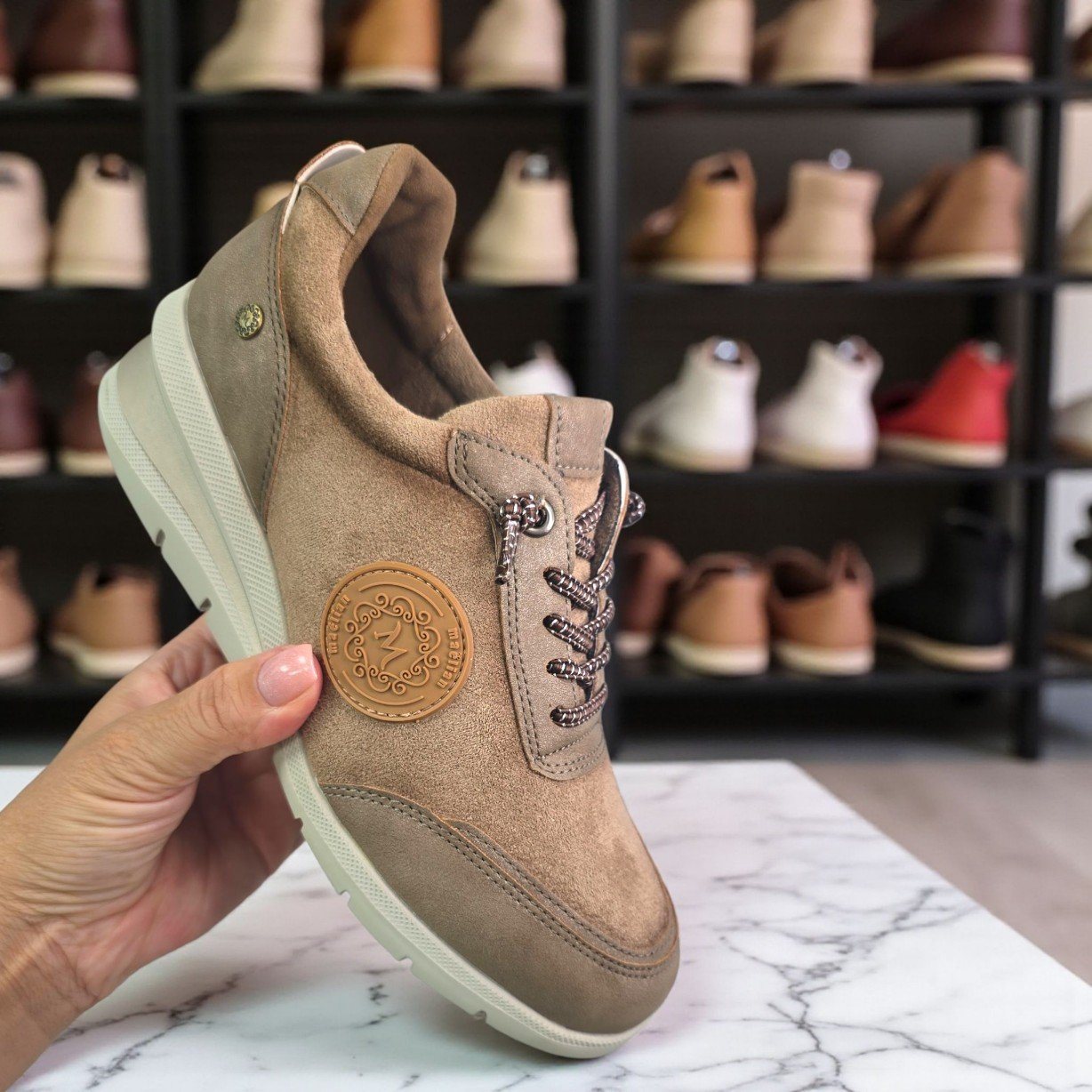 Deportivo  cuña sport, realizado en antelina con detalles de polipiel . Cordones elásticon en marron brillo para poner y quitar. Plantilla cómoda. Altura de la cuña 5 cm aprox.Este modelo talla un pelín justo el 90% de las clientas que dudan entre  dos numeros eligen el mayor.