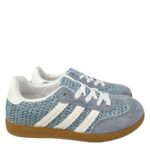 Precioso deportivo combinado en antelina y tejido tipo rafia sintética con rayas laterales en polipiel. Piso de goma oscura de 2,5 cm