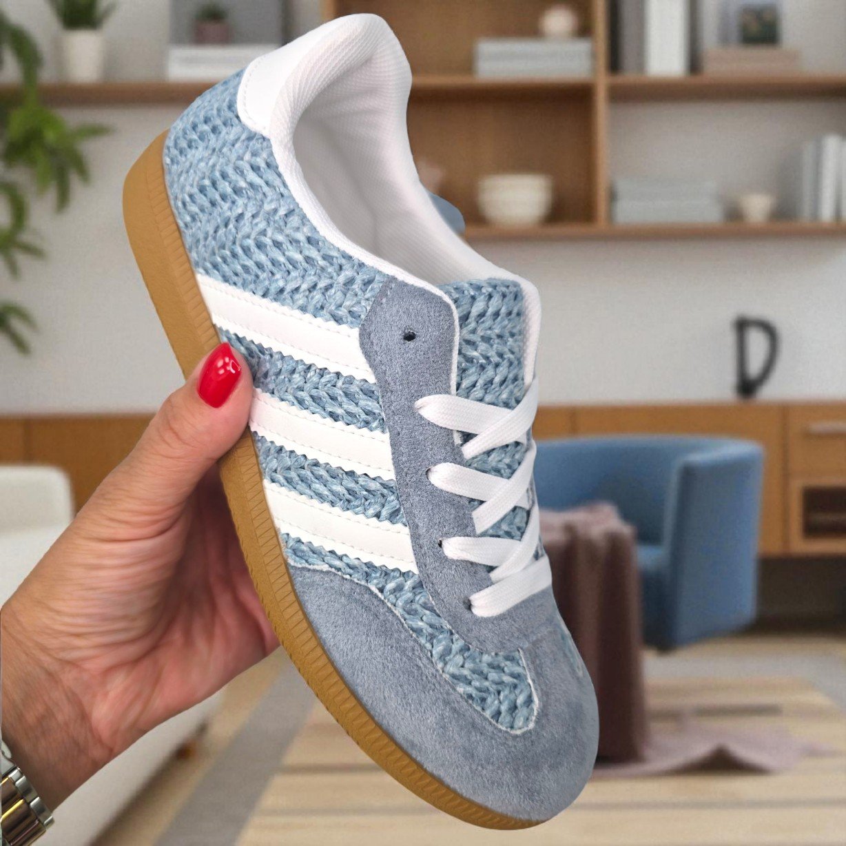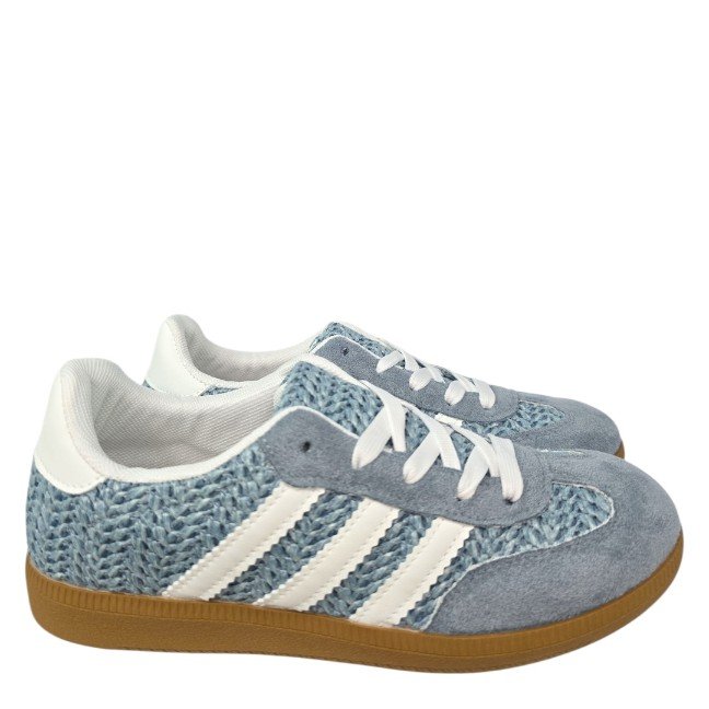 Precioso deportivo combinado en antelina y tejido tipo rafia sintética con rayas lterales en polipiel. Piso de goma oscura de 2,5 cm