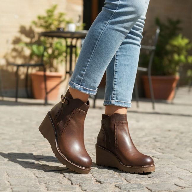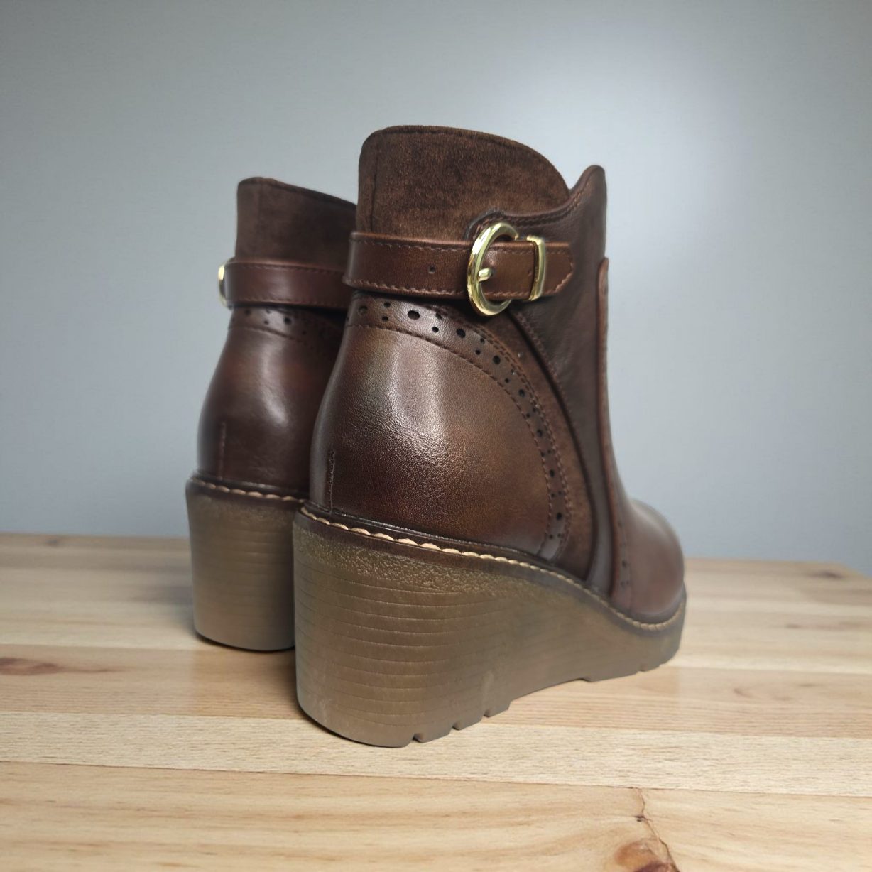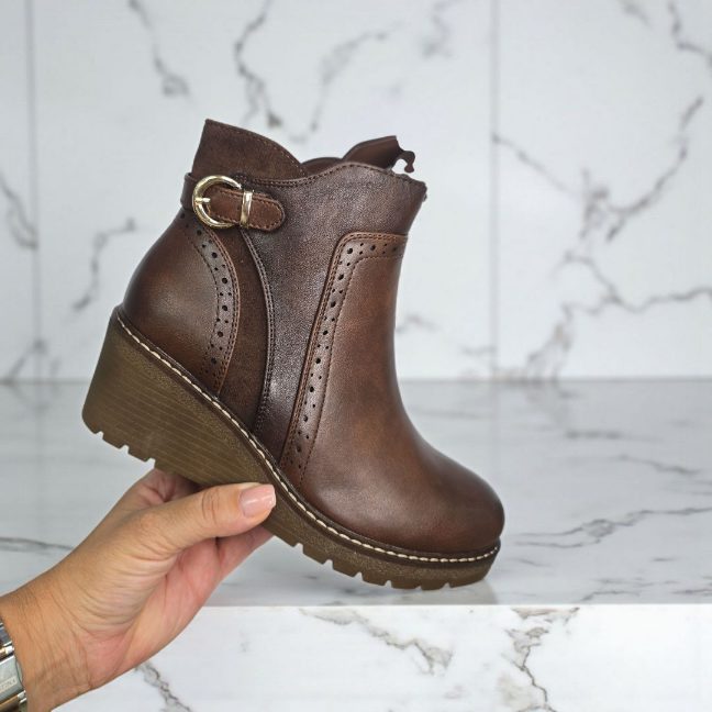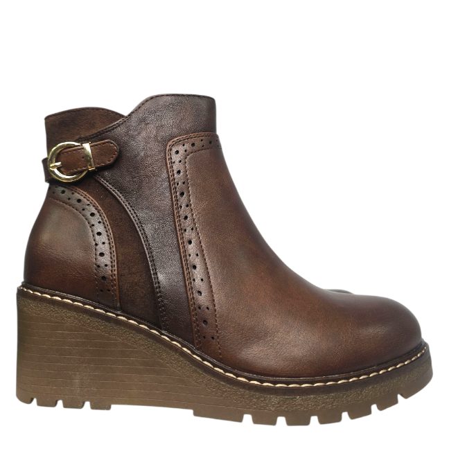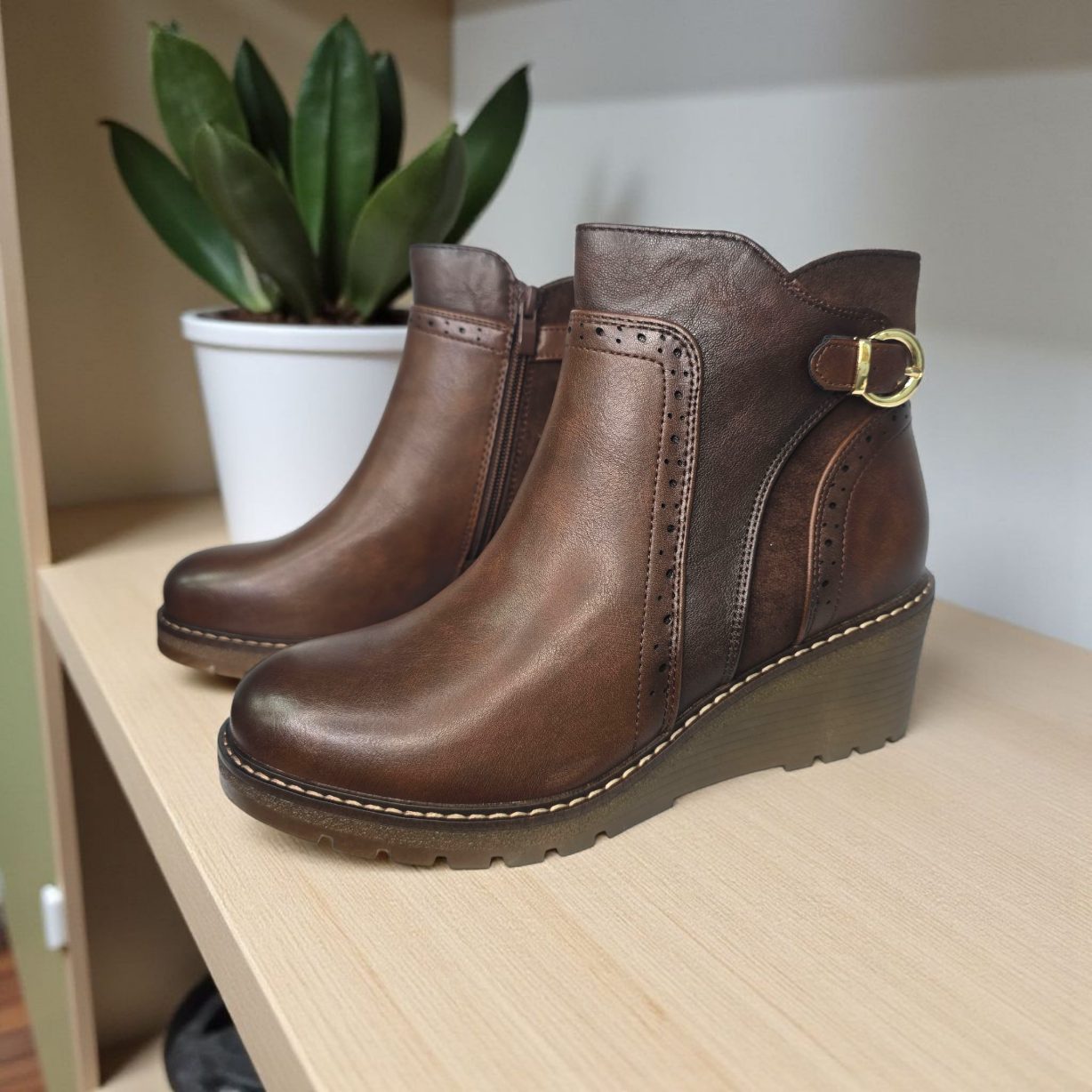 Espectacular botín de cuña, realizado en polipiel con detalles de fino picado en las terminaciones del empeine y el talón. Detalle de antelina en la trasera y adorno de hebilla fina dorada en el lateral. Cremallera para poner y quitar. Cuña de goma de 6 cm y pequeña plataforma de 2 cm . Botín versatil y cómodo. El 95% de nuestras clientas eligen su numero habitual .