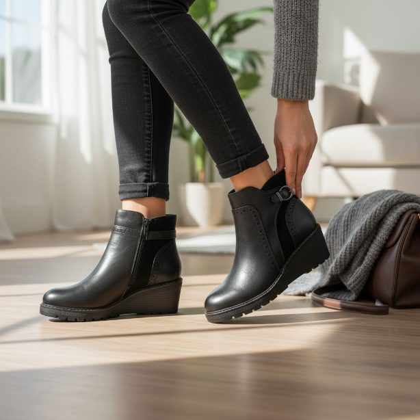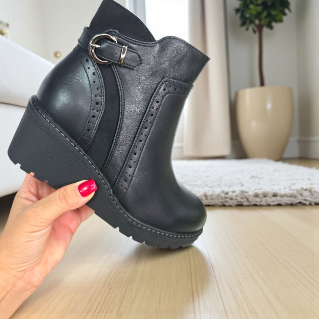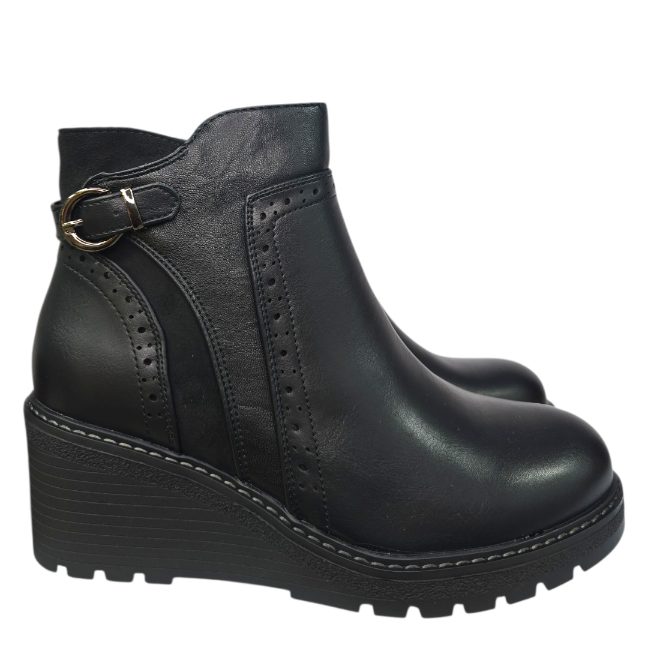 Espectacular botín de cuña, realizado en polipiel con detalles de fino picado en las terminaciones del empeine y el talón. Detalle de antelina en la trasera y adorno de hebilla fina dorada en el lateral. Cremallera para poner y quitar. Cuña de goma de 6 cm y pequeña plataforma de 2 cm . Botín versatil y cómodo. El 95% de nuestras clientas eligen su numero habitual .