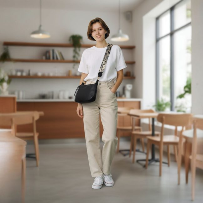 Bolso bandolera super ponible , tamaño ideal para todo.Polipiel efecto cuero  con cremallera interior para llaves y cremallera trasera. Lo ideal de este bolso versatil es su asa regulable de nylon  de buena calidad combinada  en tonos negro, gris  beig y topo haciendo un bonito patrón.